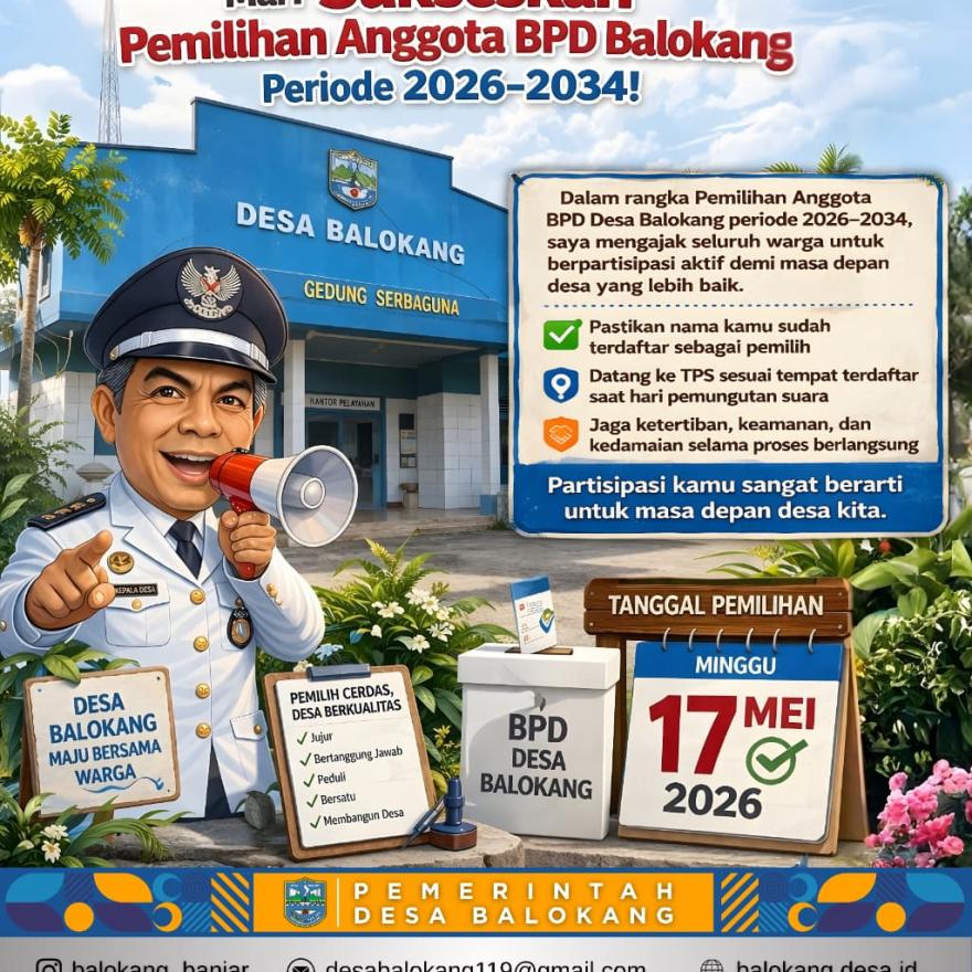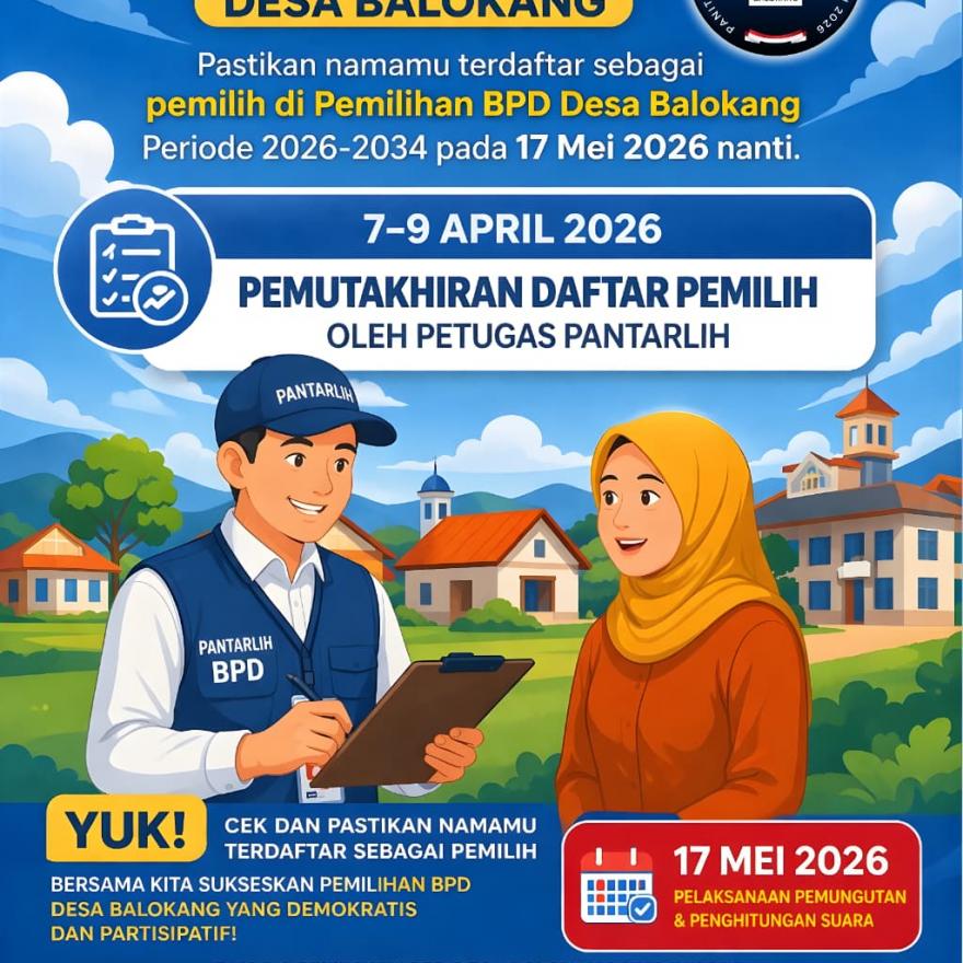 07 April 2026 18:57:40 | Administrator | 24 Kali | Berita DesaSegera cek nama anda di Daftar Pemilih Sementara yang telah diumumkan. Bila belum terdaftar segera daftarkan kepada ketua RT setempat atau kepada Panitia Pengisian BPD Desa Balokang. ..selengkapnya