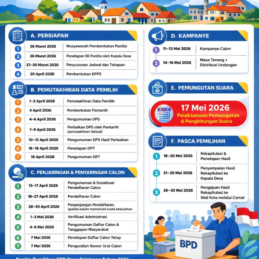 07 April 2026 18:42:20 | Administrator | 32 Kali | Berita DesaPemilihan Badan Permusyawaratan Desa (BPD) merupakan salah satu momentum penting dalam kehidupan demokrasi di tingkat desa. Tidak lama lagi, tahapan pemilihan BPD akan segera digelar. Ini menjadi kesempatan bagi masyarakat untuk menentukan wakil-wakil terbaik yang akan menyuarakan aspirasi ..selengkapnya